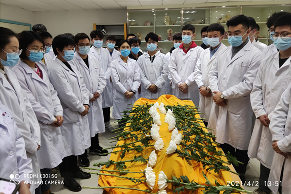又是一年清明时,4月2日《局部解剖学》课程开始前,基础医学院解剖学党支部联合形态机能实验室党支部与参加学习的同学们一起,在实验室举行了一场特殊的仪式,向为我校解剖学事业做出巨大贡献的无语良师致敬,与伟大的灵魂进行了一场心灵上的隔空对话。他们是我们的“大体老师”“无语良师”,他们奉献自己,大爱无言,是值得我们永远感激与敬佩的先行者。师生们肃立默哀,现场齐声诵读“解剖学誓词”,并向大体老师敬献鲜花。