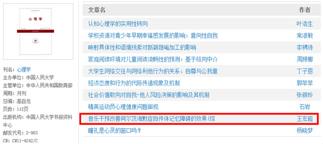 近日,心理学院新进青年教师王宏超发表在中文核心期刊《中国心理卫生杂志》上题为《音乐干预改善阿尔茨海默症自传体记忆障碍的效果(综述)》的学术论文被中国人民大学复印报刊资料《心理学》期刊全文转载,该文主要介绍了音乐干预改善阿尔茨海默症自传体记忆障碍的研究方法、音乐干预的效果和音乐干预的心理机制,并针对已有研究成果存在的不足提出了相应的建议。该研究成果在健康中国战略的背景下,为有效延缓我国老龄人口认知功能衰退的进程,提升老年人的心理健康水平提供了借鉴。
