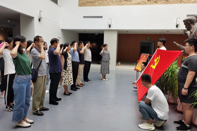 在陈列馆风云激荡、起义壮举、东征西进、征战四方、红色芦荡等展厅里,一幅幅珍贵的历史照片,一叠叠真实的文献资料,一件件厚重的革命文物,一段段感人的党史故事,再现了牛头镇抗日武装起义的全过程。党员同志们认真聆听了讲解员对牛头镇抗日武装起义历史声情并茂的解说,深刻体会到以马保三、张立训为代表的革命先烈们在探寻救国之道时的坚定意志和不懈追求,深刻认识到革命历程的艰难曲折和革命胜利的来之不易。参观学习结束后,师生党员在革命武装起义雕塑下重温了入党誓词,进一步坚定理想信念,筑牢初心使命。