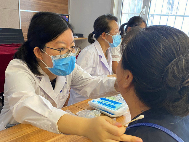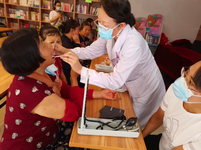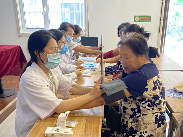十笏园社区党委书记张娟介绍了社区党建概况,表达了通过共建“双报到”工作提升社区党建工作的想法。身着白衣的口腔医学院党员志愿者们组成的“久久为功”医疗服务队发挥专业特长,为社区居民量血压、测血糖,进行口腔检查,普及医学常识和口腔保健知识,并针对居民们提出的健康问题一一认真答复,提出改善建议。