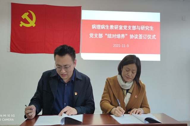 党支部书记刘江月、高伟分别代表两个支部现场签订支部共建协议,为党员导师和研究生现场结对。刘江月表示,病理病生教研室党支部党员导师人数较多,将通过“结对培养”这种新的模式和平台,为导师和研究生之间架起沟通的桥梁,充分发挥基层党组织在研究生党建和思政教育工作中有力的政治保障作用。高伟表示,将努力打造支部共建活动品牌,将党支部打造成师生思想政治工作的战斗堡垒,切实担负起为党育人、为国育才的光荣使命。