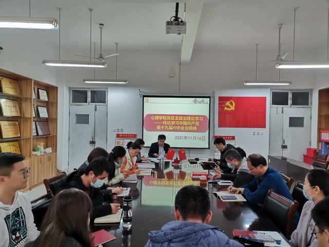 11月16日下午,心理学院党总支在会议室召开会议,传达学习党的十九届六中全会精神,全体教职工参加,党总支书记刘宪亮主持会议。