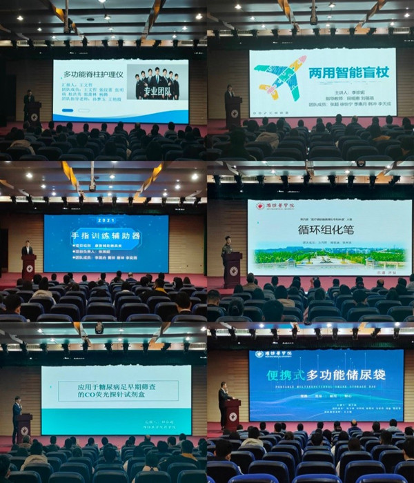 本次大赛,各个院系积极参加,共上交作品近40项,经过前期初评,最终有六支队伍进入决赛。决赛分为视频简介、PPT汇报、专家提问评分,颁奖仪式四个环节,现场精彩纷呈,亮点频现,参赛选手精心准备、沉着应对,通过幻灯片展示、现场讲解、实物演示等多种形式呈现了各自的作品,从作品的项目背景、技术方案,特色亮点、实用价值、推广前景等方面进行了详细的阐述。每支参赛队伍带来的作品都创意十足,独具特色,“多功能脊椎护理仪”集监测、提醒、调整、理疗为一体,为预防和解决社会人群的脊柱问题提供了新思路;“免疫组化笔”防水性好、价格低廉,在提高了使用次数,降低了使用成本的前提下保证了免疫组化效果;“便携式多功能储尿袋”为尿失禁患者们带来了福音,这将为他们的生活提供极大的便利;“手指训练辅助器”降低了康复治疗师的工作负担,在保证患者适当强度训练的前提下使患者的康复训练更加的舒适和便捷,解决了病人的手指康复问题;“应用于糖尿病早期筛查的CO荧光探针试剂盒”具有较小的细胞毒性、高灵敏度和安全性较高的优点,为糖尿病足的防治提供了新方法;“两用智能盲杖”可以更好的帮助盲人回归社会,充分体现了对盲人群体的人文关怀。六支队伍的参赛作品,充分体现了大学生自主研发和科研创新的能力,经过激烈的比拼,最终选出一等奖1项,二等奖2项,三等奖3项。