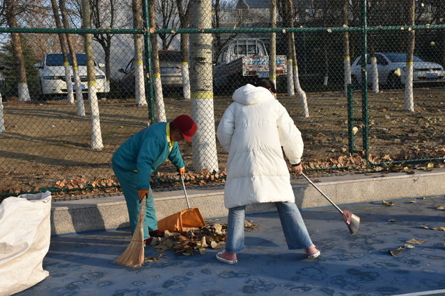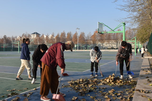 同学们分为六组,首先,由小组长介绍打扫了区域、打扫方式等注意事项。在篮球场、大学生服务中心前、操场跑道等落叶密集的区域,同学们有序展开清扫活动,即使是凛冽的寒风,也阻挡不了同学们劳动的热情。清扫完毕,同学们把落叶集中装到垃圾桶里,保证路面整洁,清洁阿姨运送方便。清洁阿姨欣慰地评价道:“这些孩子帮了我大忙了!这些落叶我自己得扫一上午,孩子们扫得太干净了!”