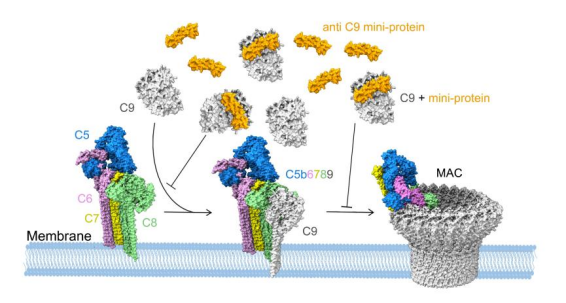 图2 补体C9迷你蛋白抑制剂阻断膜攻击复合物形成的机制示意图