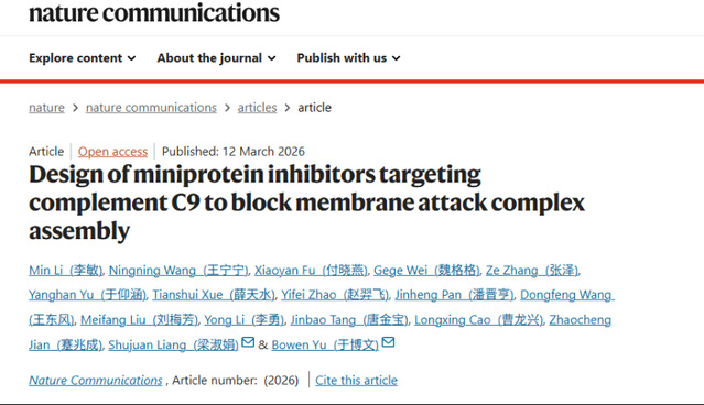 3月12日,我校基础医学院山东省高等学校“免疫微环境与炎症性疾病研究实验室”,在Nature旗下子刊Nature Communication(中科院1区Top,IF 15.7)杂志在线发表了题为Design of miniprotein inhibitors targeting complement C9 to block membrane attack complex assembly的研究论文。该成果我校为第一完成单位,硕士研究生李敏、魏格格,高级实验师付晓燕,第一附属医院研究员王宁宁,西湖大学博士后张泽为本文的共同第一作者,青年教师于博文副教授和梁淑娟教授为本文的通讯作者。