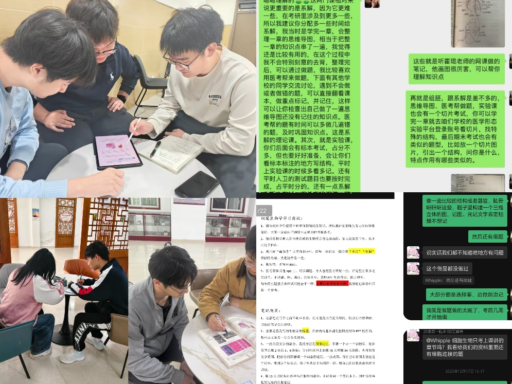 在具体实施中,学院依托帮扶记录表,建立数十组“一对一”或“一对多”的结对机制。2024级朋辈导师根据新生的课程难点与个人需求,量身定制帮扶方案。做法上突出“三步走”:资料共享,通过微信群分章节推送系统解剖学、组织胚胎学等课程的课件、笔记和案例教学资料,形成云端资源库;方法指导,结合自身备考经验,帮助新生梳理知识框架、优化复习策略、调整考前心态;难点攻坚,定期开展线下小范围答疑和重点知识串讲,针对脉管系统、神经系统等抽象章节进行面对面拆解讲解。此外,朋辈导师建立周反馈机制,及时了解新生的掌握情况,动态调整帮扶重点,确保帮扶过程扎实、内容实用。