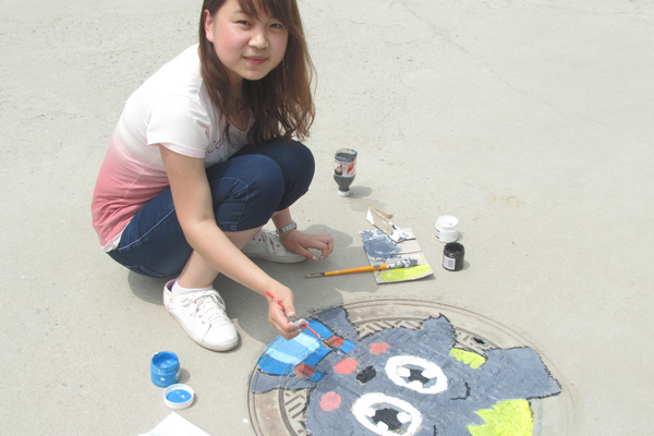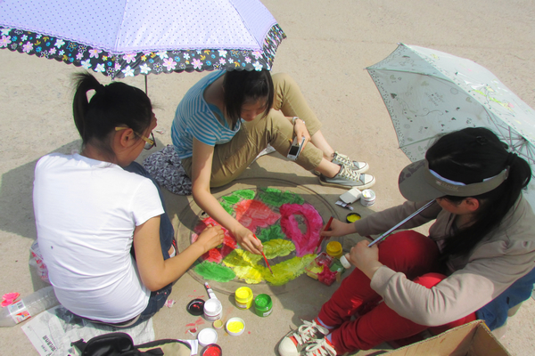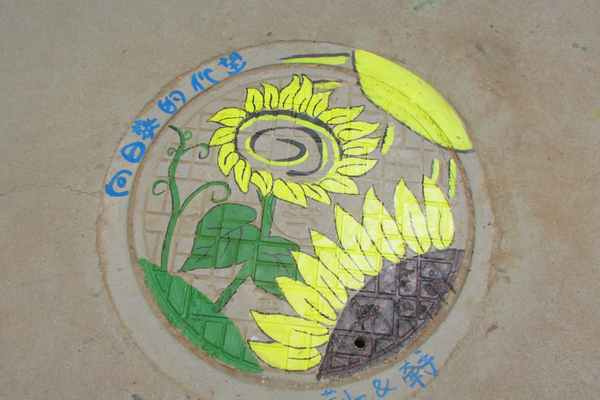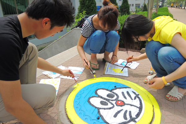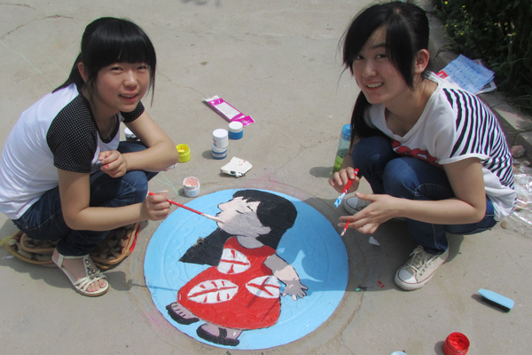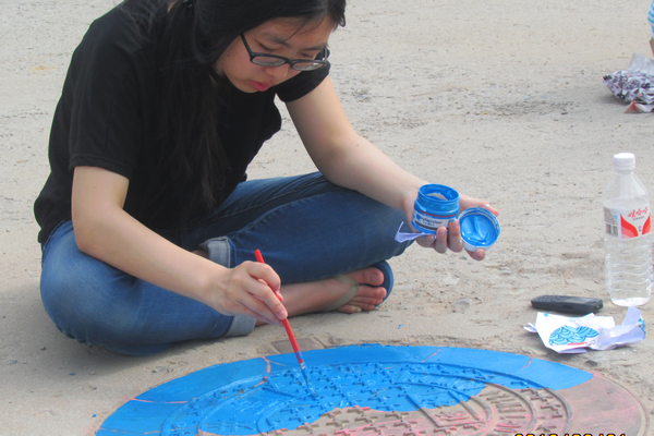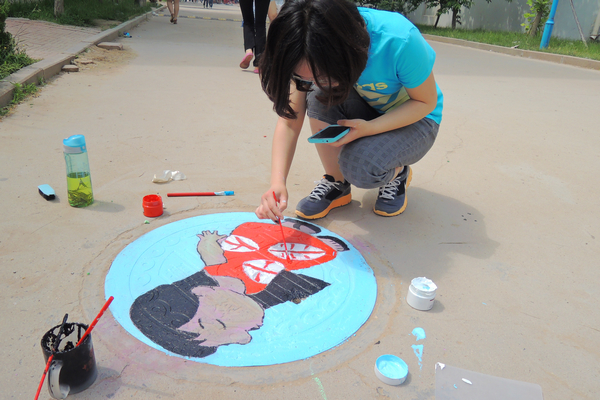 艳阳下,同学们发挥自己想象力,为校园的井盖穿上了各式各样的“新装”,机器猫、小闹钟、向日葵、脸谱等等,鲜艳的井盖既美化环境又警醒安全。于彬彬同学是组织并参与此活动的一员,她说“我们前期在各个院系征集了涂鸦素材稿,到校园里清点了井盖数目并按照古典风格、励志风格、环保风格等进行主题作画。”王星同学说“画一幅画要蹲地上半天,汗水流下来了,不过不感到辛苦,因为看到老师和同学们欣赏的目光,感觉非常开心。”