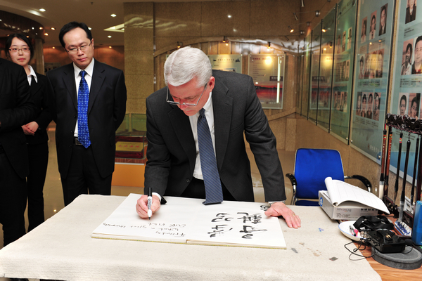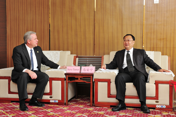 马安宁首先向美国代表团一行来我校访问表示欢迎,并向来宾简要介绍了潍坊及我校的基本情况。史蒂夫·特纳介绍了东北州立大学的基本情况及其所开设的课程特色等情况。双方就合作办学、交流互访、互派师生等深入交换了意见,达成了合作意向。会谈结束后,美国代表团一行参观了学校校史馆。