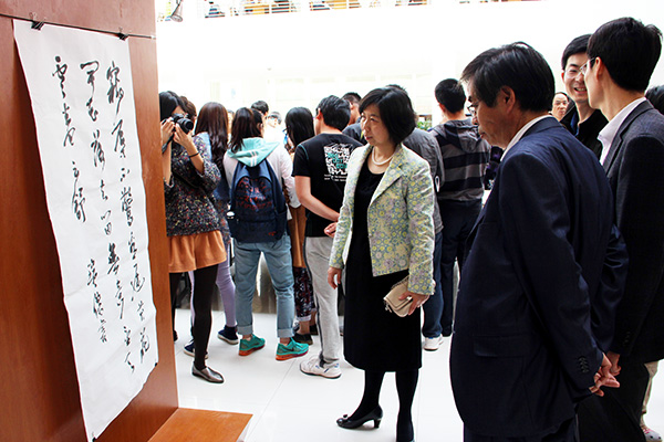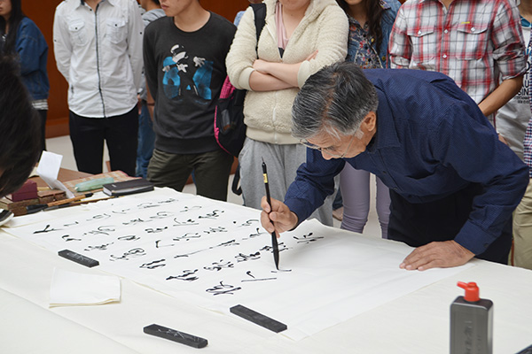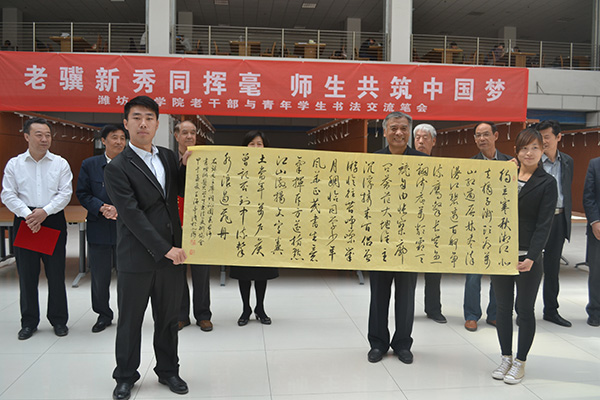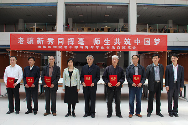 校党委副书记、关工委主任张潍华参加活动并致辞。关工委常务副主任王海亭等7位擅长书法的退休老干部及在职教工,和大学生书法美术协会的书法爱好者们齐聚一堂,即兴泼墨,挥毫抒情。7位老师受聘为大学生书法美术协会顾问,张潍华为其颁发聘书,王海亭向大学生书法美术协会赠送了墨宝。