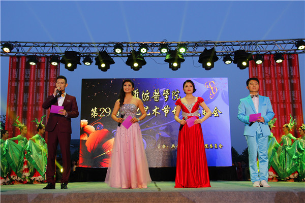 开幕式晚会分为乐道、济世和青春三个篇章。在气势磅礴的开场舞《盛世风华》中晚会拉开了帷幕。现代舞《男子汉》、歌曲联唱《爱之声》讴歌了潍医人乐道、敬业、勇于求真和敢于担当的精神;古典舞《医者说》、歌曲《因为是医生》赞美了潍医学子常怀济世仁心、投身医学事业的追求;现代舞《Crazy》、武术表演《中华好儿孙》展现了“九零后”们的青春活力。伴随着欢呼和掌声,晚会在合唱《祖国不会忘记》中落下了帷幕。