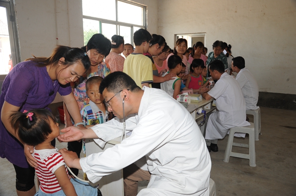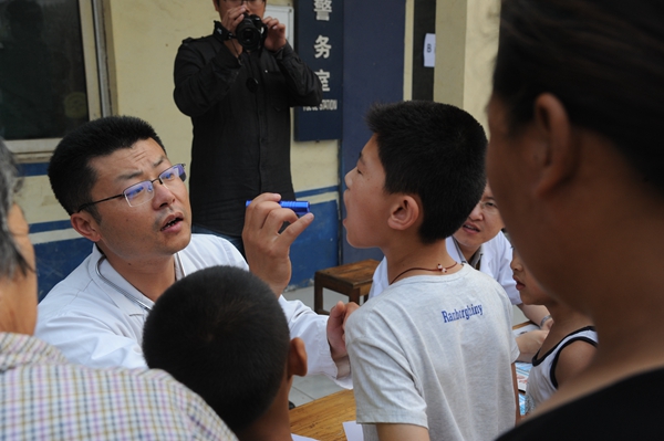 31日早晨5:30分,医疗团队的住处,已经热闹起来。简单的早饭后,大家就奔赴宋范村和土屋村。小孩子排在前,老年人紧随其后,秩序井然。排长队候诊的村民听出了医生们的声音都有些嘶哑,看出了他们烈日酷暑下仍全然不顾惜自己的状态,都很感动。
