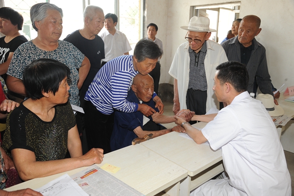 老人们查完,中青年村民开始有序地查体。王双堂村是一个大村,422户人家一天问诊500多人,天很热,秩序很好,大家都很心疼医生们汗流浃背,顾不上喝水、吃饭,还要忍受蚊虫叮咬。村支书梁廷新说:“潍坊医学院的专家实实在在地为我们做好事,做实事,给我们带来了福音啊!”