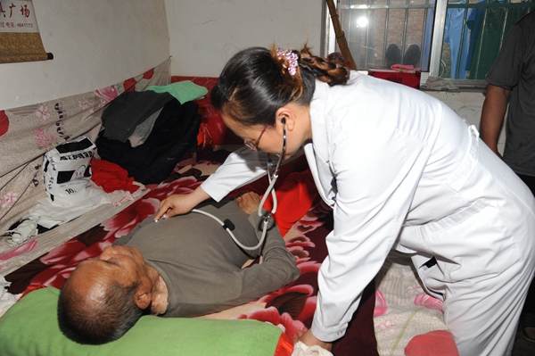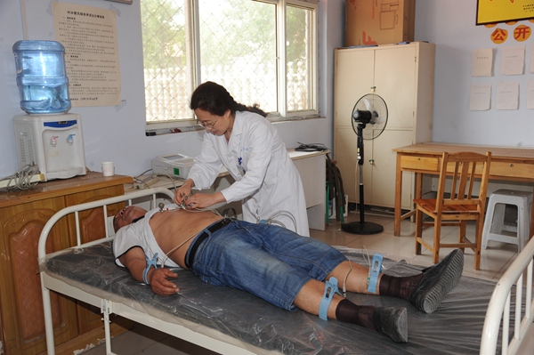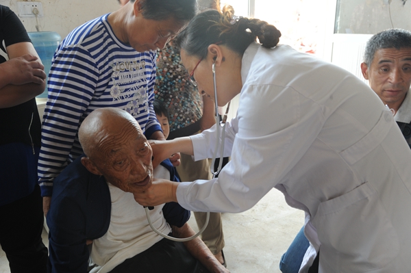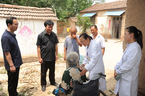 检查方式仍然采取集中检查和入户看诊相结合的方式,74岁的姚如林在现场查体时查出一点小问题,医生很细心地指导他如何去医院就诊,如何享受新型农村合作医疗待遇。随后又跟着他到家里,查看了因患脑血栓、脑积水而不能行动的老伴的病情,并拿着他老伴的十几张CT片到现场进行会诊,了解病情,开具药方,给出诊疗建议。热泪盈眶的姚如林,都不知道说什么好了。