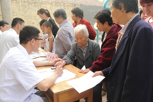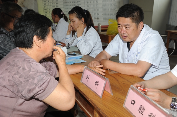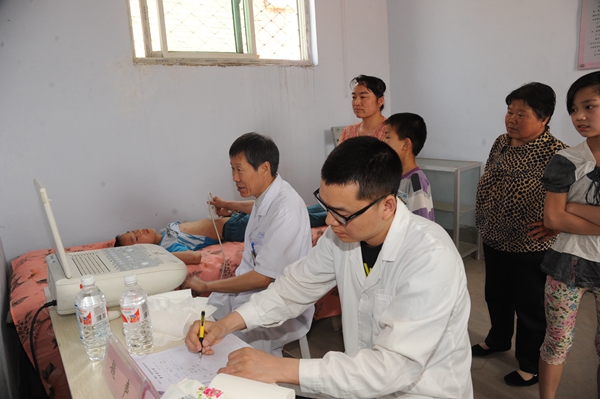 30日一大早,王双堂的村民们就呼朋引伴,来到义诊现场排起长队。由附属医院副院长亓太忠带队的医疗团队囊括了神经内、中医、儿科、脊柱、口腔、超声、心电图等科室。小孩子先进行全科健康查体,从外科、内科、发育、视力、口腔到B超、心电图,项目不少。上小学二年级的宿宏达平时很调皮,这时很乖很配合,还跟医生叔叔说:“这个儿童节最有意义、最难忘。”孩子们查完体,就嘻嘻哈哈玩去了,轮到60岁以上的老人们检查了。医生们耐心细致地与患者交流,详细询问病因病史,一丝不苟进行查体,为很多常年受病痛折磨的村民,指明了病因,明确了病灶。