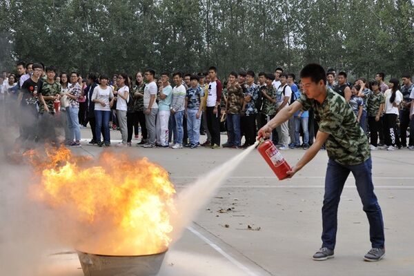 疏散演练结束后,潍城消防大队教官详细讲解灭火器等消防设施器材的使用方法,并现场演示使用灭火器灭火、穿戴消防服。学生按照灭火的步骤和方法实际操作灭火器进行灭火演练。