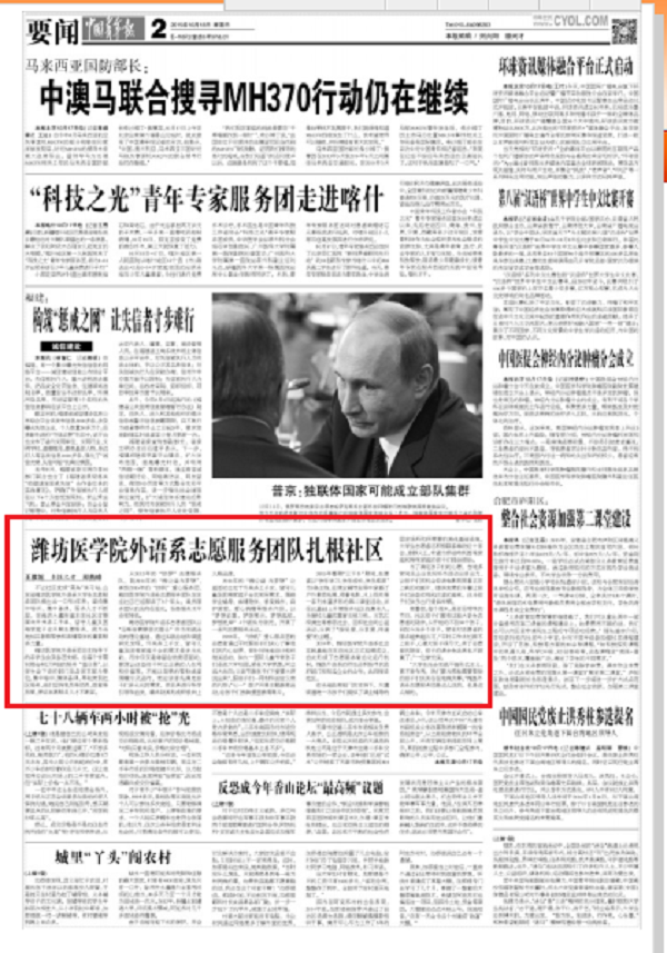 10月18日,《中国青年报》02 版报道了我校外语系志愿服务团队扎根社区。