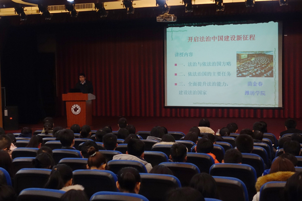 苗金春就法治与依法治国方略、依法治国的主要任务,全面提升法治能力,建设法治国家等三方面,结合国内外具体事例作了详细讲解,表明法治在当今中国建设和发展中的重要意义。