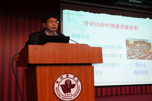 11月28日,在第二个国家宪法日到来之际,我校邀请了潍坊学院法学院院长、潍坊市政府法律顾问、潍坊市人大常委会立法咨询专家苗金春教授做客潍医大讲堂,作了题为“开启法治中国建设新征程”的讲座。公共卫生与管理学院等相关院(系)师生参加了此讲座。