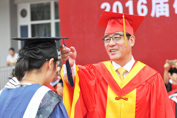 校学位评定委员会主席、校党委书记石增立和其他校领导一起为硕士学位获得者一一颁发学位证书、扶正流苏。
