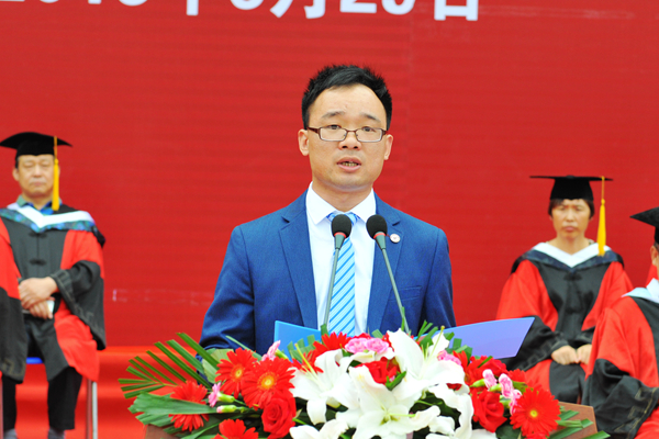 副校长朱军宣读了《潍坊医学院授予硕士学位的决定》,毕业研究生代表李玉磊、毕业研究生亲属代表吕梅贞、研究生导师代表成敏教授分别在典礼上讲话。