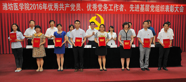 校党委副书记张潍华宣读了受中共山东省委高校工委、中共潍坊市委表彰的优秀共产党员、优秀党务工作者、先进基层党组织名单和《中共潍坊医学院委员会关于表彰优秀共产党员、优秀党务工作者、先进基层党组织的决定》。校领导为受到中共山东省委高校工委表彰的优秀共产党员王金才、优秀党务工作者于斌、先进基层党组织麻醉学系党总支,受到中共潍坊市委表彰的优秀共产党员张春燕、先进基层党组织临床医学院党委和受到学校表彰的95名优秀共产党员、19名优秀党务工作者、11个先进基层党组织颁奖。
