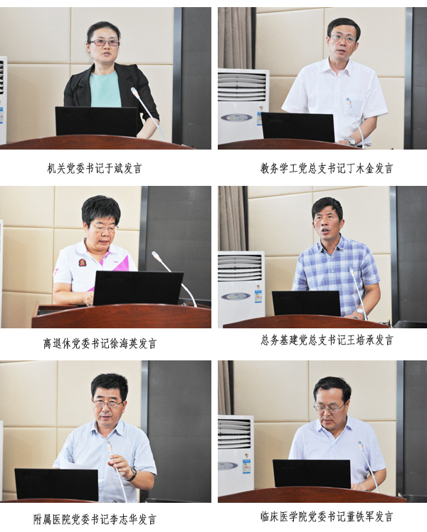 会上,机关党委书记于斌、教务学工党总支书记丁木金、离退休党委书记徐海英、总务基建党总支书记王培承、附属医院党委书记李志华、临床医学院党委书记董铁军等6人就落实党风廉政建设主体责任情况分别作了发言。