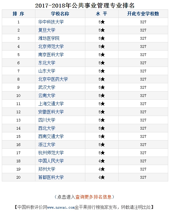在全国327所开设公共事业管理专业本科教育的院校中,我校排名第三位,是五星级专业,较去年的全国第七位有了跨越式发展;在全国45所开设麻醉学本科教育的院校中,我校位列第三名,进入全国同类专业前10%。至此,我校公共事业管理专业连续三年、麻醉学专业连续五年排名全国前十,且排名逐年上升。该排行榜每年更新一次,是国内公认较权威的高校排名。