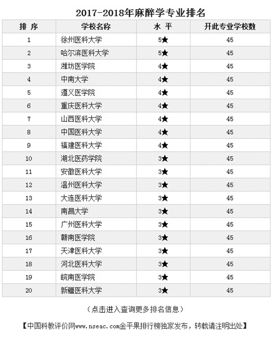 近日,中国科学评价研究中心、武汉大学中国教育质量评价中心和中国科教评价网(www.nseac.com)联合推出《中国大学及学科专业评价报告(2017-2018)》,发布了中国大学本科专业排行榜,共涉及523个本科专业。我校公共事业管理专业和麻醉学专业分别名列全国专业排行前三甲。