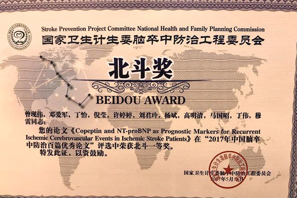 近日,从2017年中国脑卒中大会获悉,我校附属医院曾现伟博士团队发表的论文《Copeptin and NT-proBNP as Prognostic Markers for Recurrent Ischemic Cerebrovascular Events in Ischemic Stroke Patients》,获2017年中国脑卒中防治百篇论文——北斗奖一等奖。