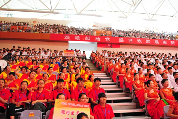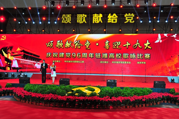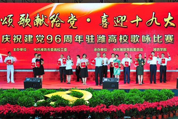 6月30日,由潍坊市委高校工委主办的“颂歌献给党 喜迎十九大”庆祝建党96周年驻潍高校歌咏比赛在潍坊学院体育馆举行。校党委副书记张潍华、纪委书记田艳玲到现场观看比赛并参加合唱。我校由校领导、离退休干部、一线教师、辅导员和在校学生组成的百人合唱团,凭借一首完美演绎的《在灿烂阳光下》获得比赛一等奖。