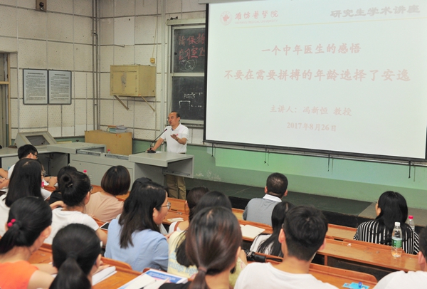 冯新恒在虞河校区做了题为《一个中年医生的感悟:不要在需要拼搏的年龄选择了安逸》的专题讲座。2017级临床专业学位研究生、部分专业老师、研究生处工作人员等200余人参加了讲座。副校长刘军主持讲座。