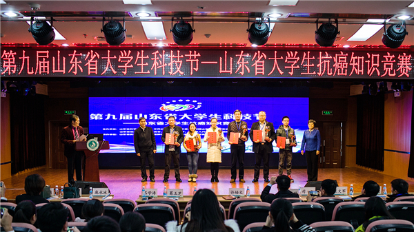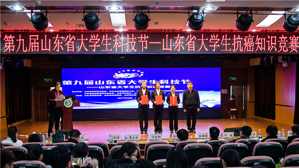 本次大赛由山东省科学技术协会、中共山东省委高校工委、共青团山东省委、山东省发展和改革委员会、山东省经济和信息化委员会、山东省教育厅和山东省人力资源和社会保障厅等7个单位共同主办,设一等奖1名,二等奖2名,三等奖3名。来自山东大学、山东省医学科学院、山东中医药大学、青岛大学等高校的24支队伍参加了此赛事。此次大赛作为我校第二十届科技文化月一项活动,校团委、学生工作处高度重视,承办单位公共卫生与管理学院精心组织,全校各专业共1037名大学生报名参加,通过校内笔试和面试初赛,选拔出贾夕蒙(临床医学专业2016级)、王惠芳(医学检验技术专业2015级)、武玉姣(预防医学专业2016级)、杜紫璇(预防医学专业2014级)、李真(预防医学专业2015级)、刘菲(临床医学专业2016级)6名同学参加在济南举行的山东省大学生抗癌知识竞赛的复赛,经过复赛初选后,杜紫璇、李真和刘菲3名同学进入总决赛。
