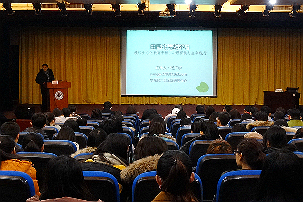 杨广学教授以《田园将芜胡不归—漫谈生态化教育干预、心理保健与生命践行》为题作了精彩报告,报告详细阐述了其从事的心理治疗、特殊儿童教育、生态化课程的改革研究,以及近年来在自闭症康复教育和生态化理论与实践中的应用研究。