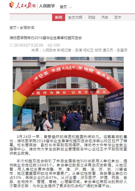 3月24日,我校2018届毕业生春季校园双选会在浮烟山校区举行,吸引了来自全国各地500余家用人单位参加,提供就业总岗位数16685个。参会单位数目之多再创历史新高。校外《人民日报社》(人民数字)、光明网等10余家重要媒体纷纷对我校优秀的人才培养质量和重视大学生充分就业工作进行了报道,引起了广泛社会反响。