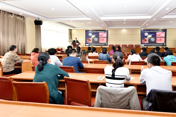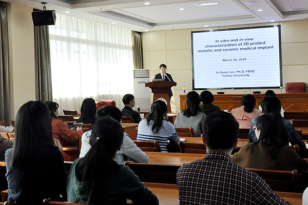 聘任仪式结束后,两位专家在办公楼四楼西会议室分别作了精彩的学术报告。Antonios G. Mikos院士以“Biomaterials for Tissue Engineering and Regenerative Medicine”为题,简要介绍了一系列用于组织工程和再生医学的生物材料的应用情况、优缺点及作用机制。In-Seop Lee教授以“In vitro and in vivo characterization of 3D printed metallic and ceramic medical implant”为题,介绍了3D打印的金属和陶瓷医用植入物体外和体内表征及其应用前景。两位专家的报告内容丰富、深入浅出,为与会者带来了前沿的科学知识和研究思路。
