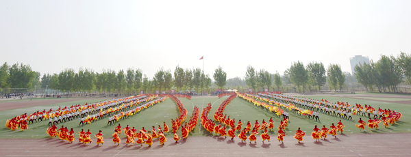 开幕式结束后,活力四射的团体表演正式开始。表演共分为“阳光路上,砥砺前行”和“乐道青春,筑梦济世”两个篇章,八百余名同学身着特色裙装、手拿红黄彩扇,伴着优美动听的音乐,起跳、旋转、变换队形,精彩的表演赢得观众的阵阵欢呼和掌声。团体表演之后,各院(系)啦啦操代表队举行了比赛。