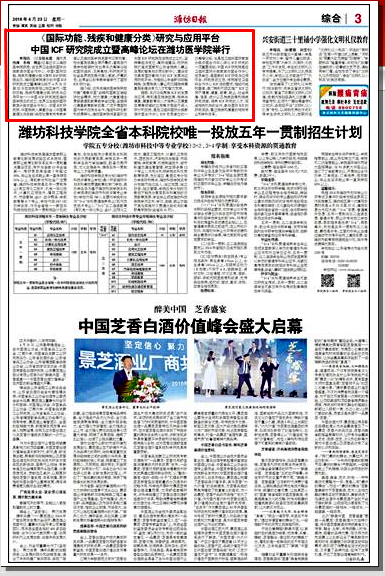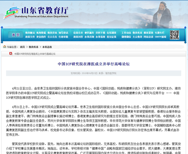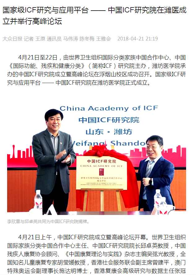 4月21日-22日,《国际功能、残疾和健康分类》研究与应用平台 —— 中国ICF研究院在我校正式成立并举行高峰论坛。对此,大众日报、山东省教育厅、山东卫生健康、中国高校之窗、潍坊日报、潍坊电视台、舜网、潍坊新闻网等多家媒体进行了宣传报道,报道中国ICF研究院在潍坊医学院成立,将打造符合国际标准的、集残疾政策与发展研究、功能和残疾分类研究、残疾评估以及康复为一体的国家级研究中心和培训基地,积极探索基于ICF的残疾与康复服务的模式、技术与方法、大数据平台标准和整体解决方案,为新时代国家残疾人事业发展和残疾康复服务提供有力人才和智力支持。