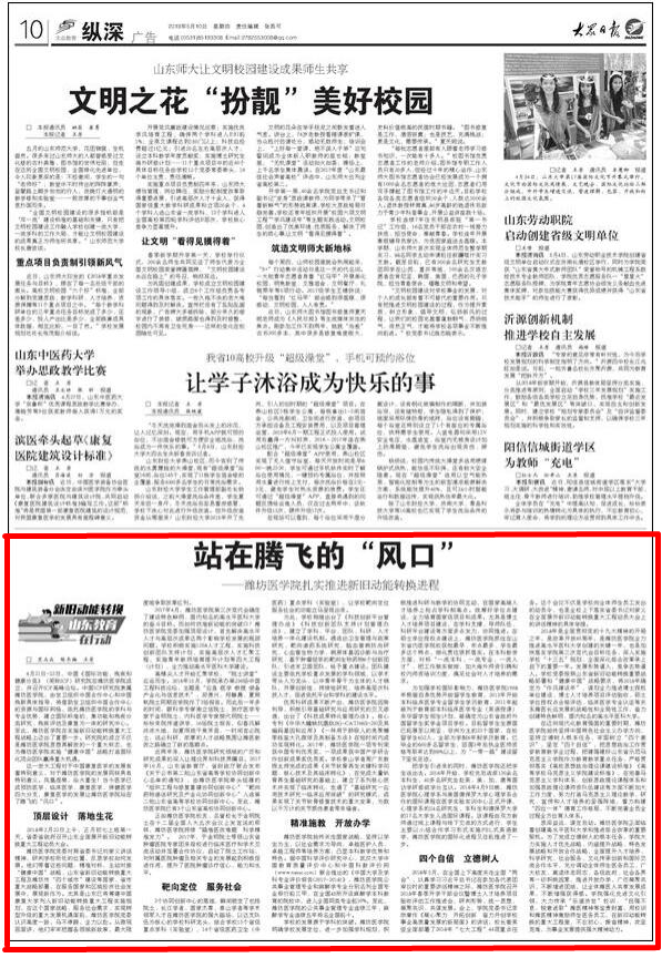 5月10日,《大众日报》刊发工作纪实通讯《站在腾飞的“风口”—— 潍坊医学院扎实推进新旧动能转换进程》(作者:史志兵、陈冬梅)。全文从顶层设计、科研创新、服务社会、开放办学、立德树人等方面,全面报道了潍坊医学院在新旧动能转换的重大工程里,站在腾飞的“风口”,不忘初心,振奋精神,攻坚克难,积极创建特色鲜明、国内知名的高水平医科大学。