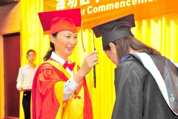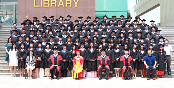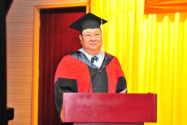 校学位评定委员会主席、校长管英俊为获得学士学位的留学生一一扶正流苏,颁发学士学位证书。