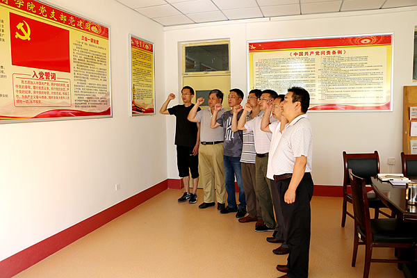 之后,全体党员面向党旗,重温入党誓词。潘庆忠要求全体党员同志要发挥先锋模范作用,尽职尽责,以实际行动践行入党誓词。