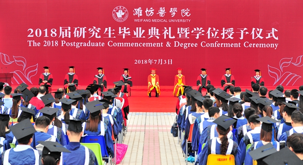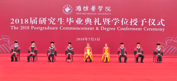 毕业典礼上,校学位评定委员会副主席、副校长孙宏伟宣读了《潍坊医学院2018届省级优秀毕业生名单》《关于授予陈晓丽等2人博士学位、授予孙静等527人硕士学位的决定》。全体校领导为获得硕士学位的毕业生授予学位、颁发学位证书,为2018届省级优秀毕业生颁发荣誉证书。管英俊为获得博士学位的毕业生授予学位,颁发学位证书。研究生导师代表张维芬教授、毕业生家属代表孙玉芬、毕业研究生代表钮昆分别在典礼上发言。