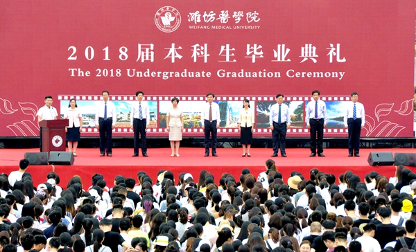 管英俊作了热情洋溢的讲话,她对2018届3700名本科毕业生顺利毕业表示热烈祝贺,向全体教职医务员工和毕业生家长表示衷心感谢。她结合2018届本科毕业生的优异表现,讲述了爱心学子、励志典型、学霸宿舍、西部志愿青年、医学图谱手绘品“文艺童鞋”等毕业生典型故事,她说,“你们把所有的青春都留在了潍医,我为优秀的你们点赞,奋斗的青春真的很燃!”