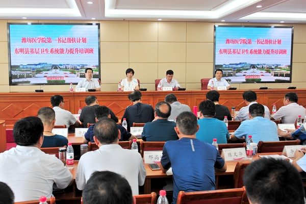 8月3日下午, 潍坊医学院第一书记帮扶计划东明县基层卫生系统能力提升培训班开班仪式在办公楼四楼会议室举行。校党委副书记张潍华,东明县卫计局局长彭异彩出席开班仪式。东明县卫计局相关科室负责人、社区和乡镇卫生院负责人、基层卫生技术骨干等,我校组织部、继续教育学院等部门负责人参加开班仪式。开班仪式由学校组织部部长张建华主持。