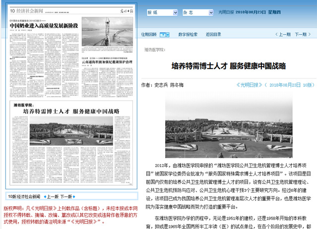 8月23日,《光明日报》第十版以“潍坊医学院培养特需博士人才 服务健康中国战略”为题刊发新闻通讯,报道我校公共卫生危机管理博士人才培养项目的建设。