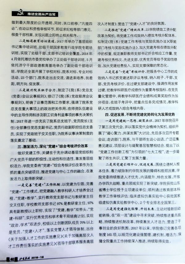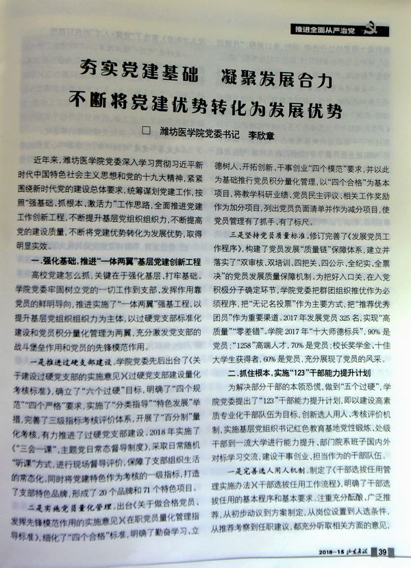 李欣章在文中指出,近年来,潍坊医学院党委深入学习贯彻习近平新时代中国特色社会主义思想和党的十九大精神,紧紧围绕新时代党的建设总要求,统筹谋划党建工作发展,强基础、抓根本、激活力,全面推进党建工作创新工程,不断提升基层党组织组织力,不断提高党的建设质量,不断将党建优势转化为发展优势,取得明显实效。他从强化基础,推进“一体两翼”基层党建创新工程;抓住根本,实施“123”干部能力提升计划;激发活力,深化“党建+”综合考核评价改革;促进发展,不断将党建优势转化为发展优势等四个方面,全面系统总结了我校不断加强党的建设,全面推进从严治党向基层延伸、向纵深发展的典型经验。