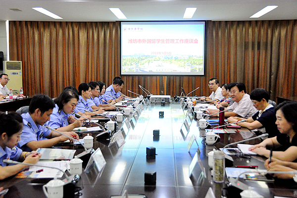 9月5日下午,潍坊市外国留学工作座谈会在浮烟山校区办公楼三楼会议室举行,潍坊市公安局、潍城、奎文、高新、寒亭以及高密分局出入境管理人员,驻潍高校、相关中学留学生工作负责人员参加座谈会。副校长孙宏伟出席并致辞,会议由市公安局出入境管理支队政委段华主持。