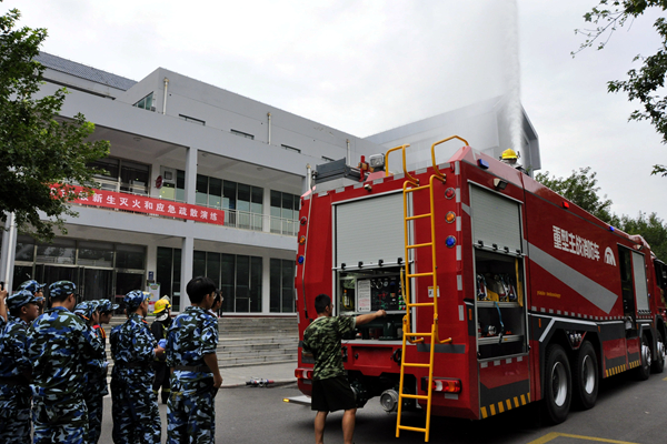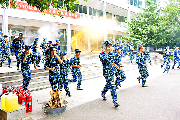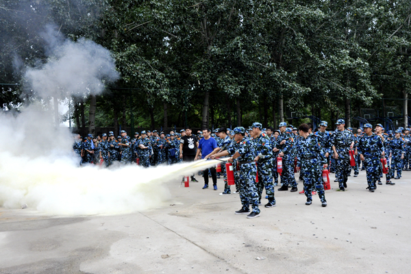 疏散演练结束后,潍城消防大队教官详细讲解灭火器等消防设施器材的使用方法,并现场演示灭火器、消防水带使用方法。新生按照灭火的规范步骤和方法,进行了灭火器灭火和消防水带灭火实战演练,在实践中体验学习消防安全知识和技能。