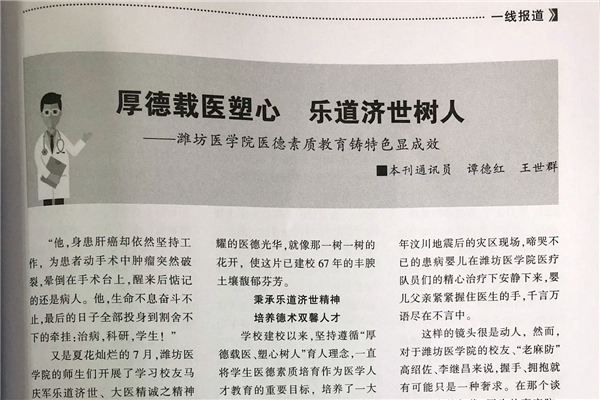 中共山东省委教育工委主办的《山东高校思政》期刊,2018年第7/8期在“一线报道”栏目中刊发文章《厚德载医塑心 乐道济世树人——潍坊医学院医德素质教育铸特色显成效》(作者:谭德红、王世群)。文章指出,潍坊医学院建校以来,坚持遵循“厚德载医、塑心树人”育人理念,一直将学生医德素质培育作为医学人才教育的重要目标,打造了全员育人、全过程育人的全方位育人格局,培养了一大批有良心、有爱心、有责任心的德术双馨的医疗卫生人才,实现了人才自身成长和服务社会需要的双向收获。