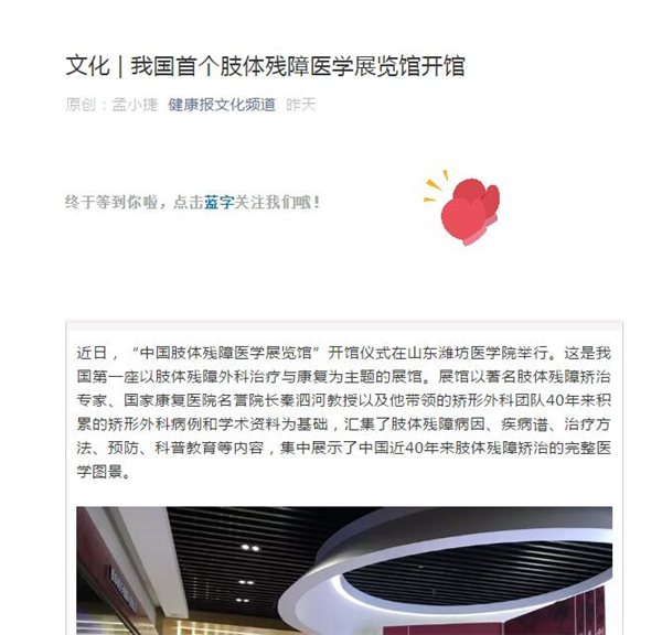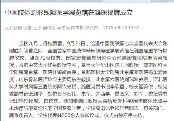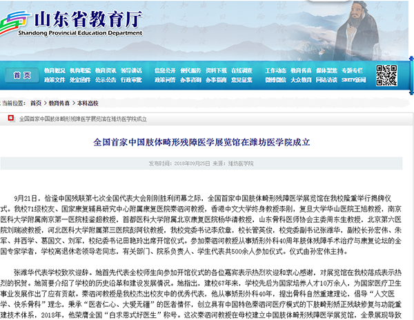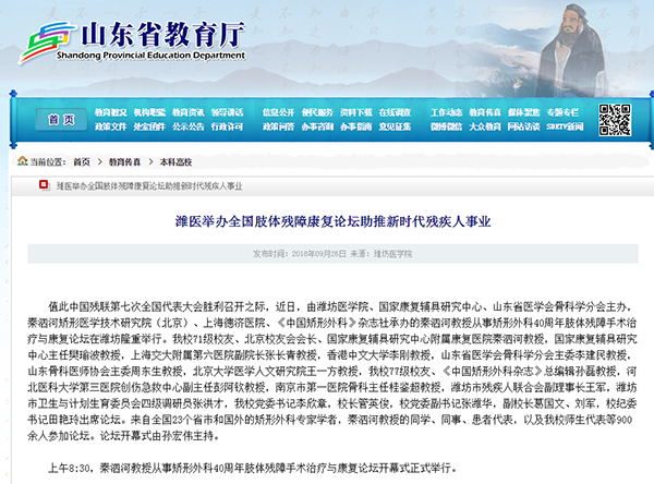 9月21日,全国首家中国肢体畸形残障医学展览馆在我校揭牌成立;9月22日,我校主办的秦泗河教授从事矫形外科40周年肢体残障手术治疗与康复论坛举行。相关活动被《健康报》、《大众日报》、山东省教育厅、山东卫生健康、山东教育电视台、搜狐网、中国高校之窗、《潍坊日报》等媒体报道,受到社会各界关注,赢得广泛赞誉。